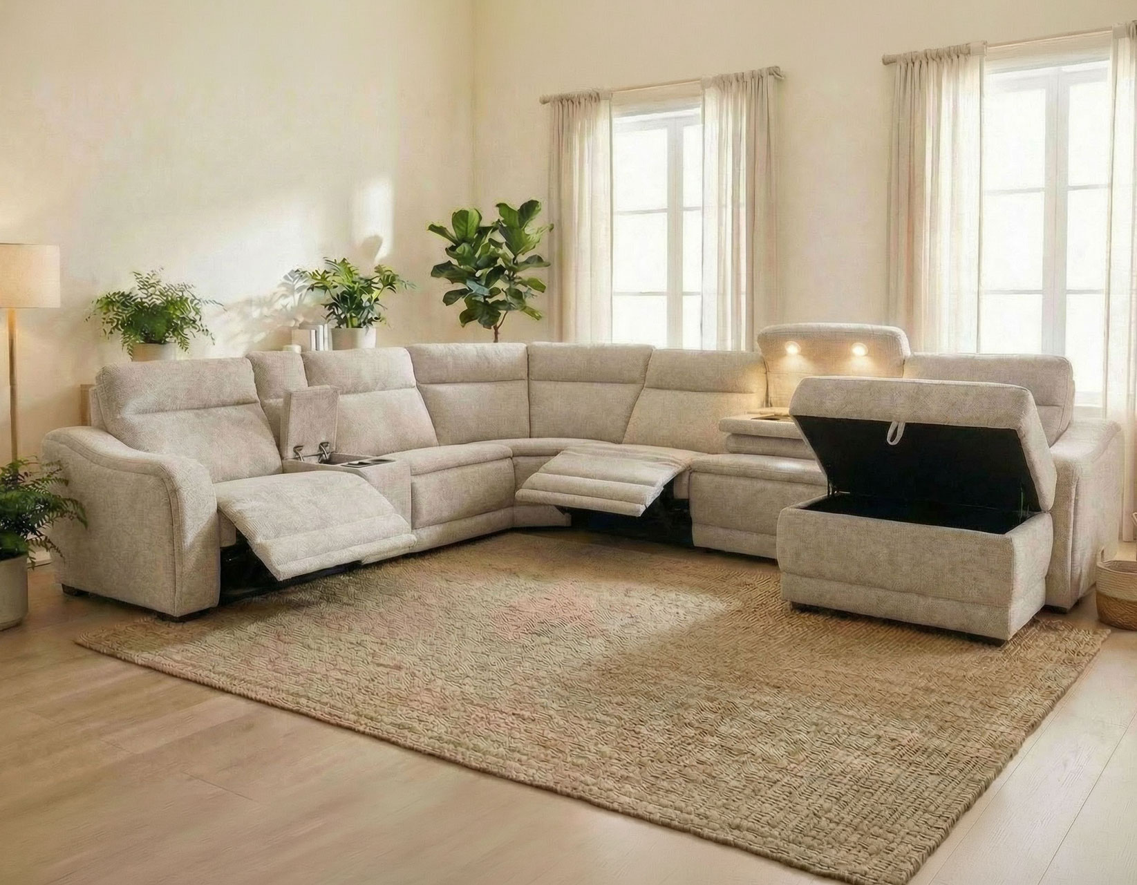 The Conroe Dual-Power Reclining 6-Piece Sectional blends modern style with personalized comfort. Upholstered in a light tan Cobblestone fabric, it offers a neutral yet warm look that complements a variety of spaces. Discreet inner-arm controls adjust the independent power headrest and footrest for customized relaxation. A lift-top storage chaise keeps blankets and essentials close at hand, while the 100% polyester cover, furniture-grade plywood frame, and sinuous wire springs provide lasting durability and everyday comfort.
